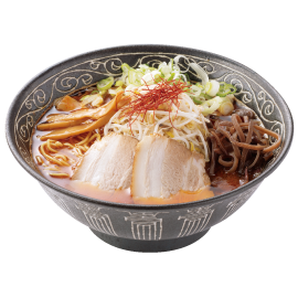 宮崎の冷汁をイメージして、コクのあるとんこつスープをベースにして仕上げました。 自家製太麺で、普通盛、大盛、特盛とサイズが選べ、全て価格は同じ。お好みで「温」・「冷」が選べます。♪オススメは「冷」!残ったスープにご飯を入れると、冷汁みたいでさらにうまい!
